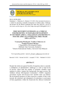 Munhande, Constantine and Chikowore, Godfrey and Maraire, Fungayi Promote (2023) Free Movement of Persons as A Vehicle for Promoting Sustainable Development in Southern Africa: Challenges and Prospects for The African Continental Free Trade Area (AfCFTA). Journal of Governance and Development (JGD), 19 (1). pp. 49-65. ISSN 2289-4756
