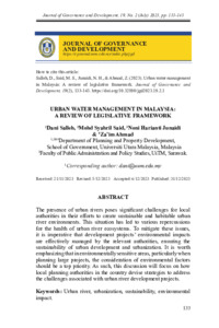 Salleh, Dani and Said, Mohd Syahril and Junaidi, Noni Harianti and Ahmad, Za’im (2023) Urban Water Management in Malaysia: A Review of Legislative Framework. Journal of Governance and Development (JGD), 19 (2). pp. 133-143. ISSN 2289-4756