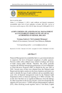 Zahrin, Zuriana and Mohamad, Siti Syuhadah (2023) Audit Certificate and Financial Management Accountability Index Level of Local Authorities in Kedah, 2002-2019. Journal of Governance and Development (JGD), 19 (2). pp. 189-203. ISSN 2289-4756