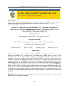 Hassan, Shahizan and Shiratuddin, Norshuhada (2023) MYDEGS supervisor selection system: Towards promoting expertise of theses supervisors in Malaysia higher education institutions to global audience. Global Business Management Review (GBMR), 15 (2). pp. 20-33. ISSN 2180-2416