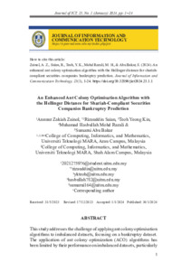 Zainol, Annuur Zakiah and Saian, Rizauddin and Teoh, Yeong Kin and Mohd Razali, Muhammad Hasbullah and Abu Bakar, Sumarni (2024) An Enhanced Ant Colony Optimisation Algorithm with the Hellinger Distance for Shariah-Compliant Securities Companies Bankruptcy Prediction. Journal of Information and Communication Technology, 23 (1). pp. 1-24. ISSN 2180-3862