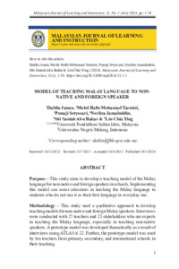 Purpose – This study aims to develop a teaching model of the Malay language for non-native and foreign speakers in schools. Implementing this model can assist educators in teaching the Malay language to students who do not use it as their first language in everyday use. Methodology – This study used a qualitative approach to develop teaching models for non-native and foreign Malay speakers. Interviews were conducted with 27 teachers and 23 stakeholders who are experts in teaching the Malay language, especially in teaching non-native speakers. A prototype model was developed thematically as a result of interviews using ATLAS.ti 22. Further, the prototype model was used by ten teachers from primary, secondary, and international schools in their teaching. Findings – This study has succeeded in developing a model for teaching the Malay language to non-native speakers and foreigners that includes five elements: teaching strategies, individual differences, input, social, and motivation. This model strongly emphasises instruction involving interaction, communication, and bilateral relations as a medium for students’ language acquisition and meaningful input. Verbal interaction between teachers and students can stimulate and improve students’ language skills in learning Malay. Significance – This model can help teachers teach the Malay language to non-native speakers and foreigners with a greater focus on achieving learning objectives. This model is expected to expand the usage, cultivate interest, and facilitate teaching the Malay language in educational institutions.