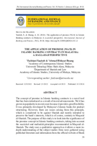 Yaakub, Fadziani and Buang, Ahmad Hidayat (2024) The Application of Promise (Wa‘D) in Islamic Banking Contracts in Malaysia: A Maslahah Perspective. International Journal of Banking and Finance (IJBF), 19 (1). pp. 39-56. ISSN 2811-3799