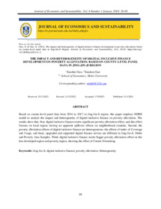 Guo, Xiaohui and Gao, XiaoKun and UNSPECIFIED (2024) The Impact and Heterogeneity of Digital Inclusive Finance Development on Poverty Alleviation - Based on County-Level Panel Data in Jing-Jin-Ji Region. Journal of Economics and Sustainability (JES), 6 (1). pp. 20-40. ISSN 2637-1294