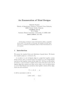 Ibrahim, Haslinda and Wallis, W. D. (2005) An Enumeration of Triad Designs. Journal of Combinatorics Information and System Sciences, 30. 05-17. ISSN 0250-9628