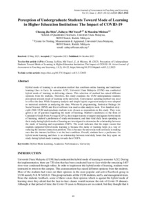 Choong Jia, Sin and Md Yusof, Zahayu and Misiran, Masnita (2023) Perception of Undergraduate Students Toward Mode of Learning in Higher Education Institution: The Impact of COVID-19. Asian Journal of Assessment in Teaching and Learning, 13 (2). pp. 10-22. ISSN 2821-2916