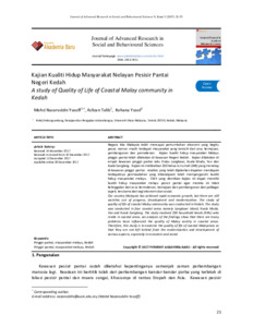 Negara kita Malaysia telah mencapai pertumbuhan ekonomi yang begitu pesat, namun masih terdapat masyarakat yang tersisih dari arus kemajuan, pembangunan dan pemodenan. Kajian kualiti hidup masyarakat Melayu pinggir pantai telah dilakukan di kawasan Negeri Kedah. Kajian dilakukan di empat kawasan pinggir pantai iaitu Pulau Langkawi, Kuala Muda, Yan dan Kuala Sanglang. Kajian ini melibatkan 250 ketua isi rumah (KIR) yang menetap di kawasan pinggir pantai. Analisis yang telah dijalankan dapatan mendapati terdapatnya permasalahan yang dikenalpasti telah mempengaruhi kualiti hidup masyarakat melayu. Oleh yang demikian kajian ini dapat meneliti kualiti hidup masyarakat melayu pesisir pantai agar mereka ini tidak ketinggalan dari arus kemodenan, kemajuan dan pembangunan dari pelbagai aspek, terutama dari segi ekonomi dan sosial. Our country Malaysia has achieved rapid economic growth, but there are still societies out of progress, development and modernization. The study of quality of life of coastal Malay community was conducted in Kedah. The study was conducted in four coastal areas namely Langkawi Island, Kuala Muda, Yan and Kuala Sanglang. The study involved 250 household heads (KIRs) who reside in coastal areas. An analysis of the findings show that there are many problems have influenced the quality of Malay society in coastal areas. Therefore, this study is to examine the quality of life of coastal Malaysians so that they are not left behind from the modernization and development of various aspects, especially in economic and social