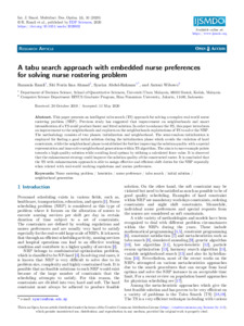 Ramli, Razamin and Ahmad, Siti Nurin Ima and Abdul-Rahman, Syariza and Wibowo, Antoni (2020) A tabu search approach with embedded nurse preferences for solving nurse rostering problem. International Journal for Simulation and Multidisciplinary Design Optimization (IJSMDO), 11 (10). pp. 1-10. ISSN 1779-6288