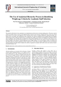 W. Muhamad Radzi, Wan Norsyafawati and Nordin, Norshahrizan and Ramli, Razamin and Abashah, Aidanazima and Ramlan, Sayang Nurshahrizleen (2018) The Use of Analytical Hierarchy Process in Identifying Weight age Criteria for Academic Staff Selection. International Journal of Engineering & Technology, 7 (3.21). pp. 181-184. ISSN 2227-524X