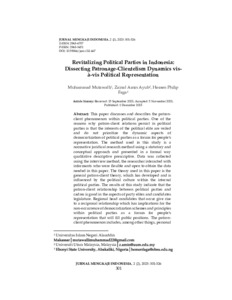 Mutawalli, Muhammad and Ayub, Zainal Amin and Faga, Hemen Philip (2023) Revitalizing Political Parties in Indonesia: Dissecting Patronage-Clientelism Dynamics visà-vis Political Representation. Jurnal Mengkaji Indonesia, 2 (2). pp. 301-326. ISSN 2963-3451