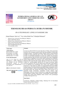 Coronavirus 2019 (COVID 19) mula dilaporkan di Wuhan, China pada bulan Disember 2019. Penularan wabak ini amat cepat dan merebak ke seluruh dunia sehingga memaksa Pertubuhan Kesihatan Sedunia (WHO) mengisytiharkan COVID 19 sebagai pandemik pada 11 Mac 2020. Pengurusan krisis seperti COVID 19 memerlukan pendekatan bersepadu dan realistik, dan penumpuan terhadap teknologi dapat membantu urusan menjadi lebih cekap. Sungguhpun teknologi IR 4.0 digunakan secara meluas dalam mendepani krisis pandemik, namun undang-undang yang berkaitan seperti undang-undang harta intelek khususnya hak cipta dan paten dengan teknologi ini harus terus dilindungi. Artikel ini embincangkan teknologi IR 4.0 seperti kecerdasan buatan (artificial intelligence atau AI) dan rantaian blok (blockchain) yang diaplikasi di era pandemik dan perlindungan harta intelek yang berkaitan dengan teknologi ini. Bagi tujuan ini, artikel ini menggunakan kaedah penyelidikan undang-undang secara penyelidikan perpustakaan dengan menganalisa sumber primer dan sekunder. Artikel ini merumuskan bahawa Teknologi IR 4.0 seperti kecerdasan buatan dan rantaian blok dilihat sebagai suatu permata di era pandemik kerana menerusinya, komunikasi sesama manusia dapat dikurangkan. Selain itu, menerusi teknologi ini, ia juga dapat mengurangkan kebergantungan terhadap tenaga manusia. Penambaikkan terhadap undangundang harta intelek boleh dilakukan dalam memberi lebih perlindungan terhadap Teknologi IR 4.0 ini
