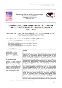 Abd Aziz, Ahmad Shamsul and Mohd Noor, Nor Azlina and Mohamed, Khadijah (2020) Keperluan Dalihan Kepentingan Awam dalam Undang-undang Hak Cipta di Era Teknologi Maklumat. International Journal of Law, Government and Communication, 5 (19). pp. 107-117. ISSN 0128-1763