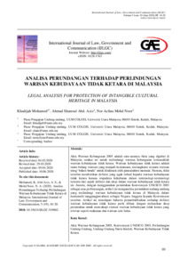 Mohamed, Khadijah and Abd Aziz, Ahmad Shamsul and Mohd Noor, Nor Azlina (2020) Analisa Perundangan Terhadap Perlindungan Warisan Kebudayaan Tidak Ketara di Malaysia. International Journal of Law, Government and Communication, 5 (19). pp. 10-20. ISSN 0128-1763