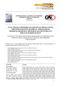 Kajian klinikal adalah satu ‘siasatan’ untuk mencari vaksin atau penawar kepada pelbagai jenis penyakit seperti HIV/AIDS, H1N1, leukemia, kanser dan terkini adalah Covid-19. Pendek kata, jawapan bagi setiap masalah atau persoalan perubatan serta penjagaan kesihatan manusia hanya dapat diketahui melalui kajian klinikal. Namun begitu, kajian klinikal tidak dapat dijalankan tanpa penyertaan terutamanya dari kalangan golongan muda atau belia sebagai subjek kerana berpotensi untuk kajian pencegahan penyakit dan rawatan pada masa depan. Bagaimanapun dapatan kajian mendapati pengrekrutan subjek dari golongan ini bukanlah mudah. Dapatan satu kajian menunjukkan bahawa mereka yang berumur antara 18 hingga 24 tahun paling tidak bersedia untuk menyertai dalam kajian klinikal. Dalam kajian seterusnya, dapatan menunjukkan kadar penyertaan mereka yang berumur 15 hingga 39 tahun dalam kajian klinikal barah adalah yang paling rendah dari mana-mana kumpulan umur di peringkat global. Oleh itu, tujuan artikel ini adalah untuk melihat kesediaan golongan muda khususnya pelajar untuk menyertai dalam kajian klinikal dengan memfokuskan kepada sebab-sebab yang mempengaruhi dan menghalang penyertaan sebagai subjek kajian. Artikel berbentuk konseptual ini ialah kajian kualitatif yang menggunakan metod kajian perpustakaan