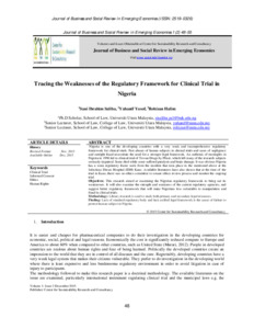Salihu, Sani Ibrahim and Yusof, Yuhanif and Halim, Rohizan (2015) Tracing the Weaknesses of the Regulatory Framework for Clinical Trial in Nigeria. Journal of Business and Social Review in Emerging Economies, 1 (2). pp. 48-55. ISSN 2519-0326