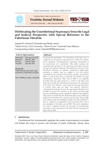 Hamad, Ahmed M. A. and Mohd Anuar, Haslinda (2022) Deliberating the Constitutional Supremacy from the Legal and Judicial Perspective with Special Reference to the Palestinian Situation. Yustisia Jurnal Hukum, 11 (2). pp. 125-135. ISSN 0852-0941