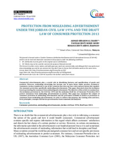 Commercial advertisements play a crucial role in identifying features and specifications of goods and products. However, misleading advertising has become one of main forms unfair practise customers/ consumers. Jordan considered as one of the countries that does not have rules and provisions that regulate the consumer protection specifically misleading advertisements. This paper discussed about the Jordanian laws in protecting the consumer from misleading advertisements. The objective of the article to examine how the Jordanian provisions by the Civil law 1976 and the Jordanian Draft law of Consumer Protection 2013 protect consumers from misleading advertisements in Jordan. This paper has examined the subject of consumer protection in misleading advertisement and the provisions available in Jordan as protection to consumers from misleading advertisements. In order to achieve this purpose, the existing rules and laws, facts, principles, concepts and the law provisions has been examined and analyzed