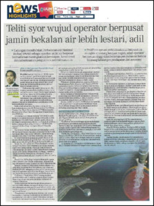 Muhammad Nazrul Bin Abdul Rani (2024) Teliti Syor Wujud Operator Berpusat Jamin Bekalan Air Lebih Lestari , Adil. (9 September 2024). in Utusan Malaysia, Kuala Lumpur, p. p. 12.