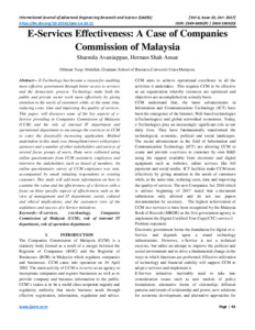 E-Technology has become a reason for enabling more effective government through better access to services and the democratic process. Technology make both the public and private sector work more effectively by giving attention to the needs of customers while, at the same time, reducing costs, time and improving the quality of services. This paper, will discusses some of the key aspects of e- Service providing in Companies Commission of Malaysia (CCM) and the role of internal IT department and operational department to encourage the eservices in CCM to cater the drastically increasing application. Method undertaken in this study was throughinterviews with project sponsors and a number of other stakeholders and surveys of several focus groups of users. Data were collected using online questionnaire from CCM customers, employees and interview the stakeholders such as board of members. An online questionnaire survey of CCM employees was sent, accompanied by email imitating respondents to existing customer. This study will add more information on how to examine the value and the effectiveness of e-Services with a focus on three specific aspects of effectiveness such as the view of management and IT department; social, cultural and ethical implications; and the customers view of the usefulness and success of e-Service initiatives