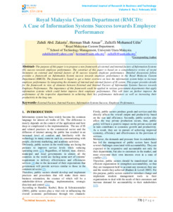 Abd Zakaria, Zuhdi and Anuar, Herman Shah and Mohamed Udin, Zulkifli (2015) Royal Malaysia Custom Department (RMCD): A Case of Information Systems Success towards Employee Performance. International Journal of Research in Business and Technology, 06 (01). pp. 770-775. ISSN 2291-2118