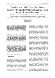 Zakaria, Izatul Husna and Bakri, Adnan and Ibrahim, Jafni Azhan and Othman, Abdul Aziz (2018) Development of Oil Plam Fiber Waste Inventory System for Optimal Electricity Grid Supply: Biomass Briquette. International Journal of Supply Chain Management (IJSCM), 7 (2). pp. 2051-3771. ISSN 2050-7399
