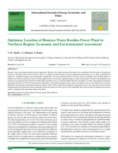 Mohd Shafie, Shafini and Othman, Zakirah and Hami, Norsiah (2020) Optimum Location of Biomass Waste Residue Power Plant in Northern Region: Economic and Environmental Assessment. International Journal of Energy Economics and Policy, 10 (01). pp. 150-154. ISSN 2146-4553