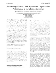 This aims to explore a set of technological factors among the factors for ERP adoption by organizations in developing countries, especially in the context of Libya. The conceptual framework, and the factors and relationships proposed in the review process confirm the impact of the proposed framework. The discussion of certain factors with reference to particular countries have some common characteristics that unite their comparison in terms of the government sector. There are many similarities between the cultural, structural and technological factors considered. It is important to integrated these factors to determine their importance in a comprehensive study. This provides knowledge of their impact on ERP adoption and organizational performance, because it is considered a starting point for further studies in the Middle East and North Africa, especially in the context of Libya. Keywords - ERP system, organization performance, Technology factors, developing countries, Libya