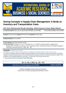 Muhammad Khodri Harahap, Afif Zuhri and Abdul Rahim, Mohd Kamarul Irwan (2023) Saving Concepts in Supply Chain Management: A Study on Inventory and Transportation Costs. International Journal of Academic Research in Business and Social Sciences (IJARBSS), 13 (6). pp. 239-252. ISSN 2222-6990