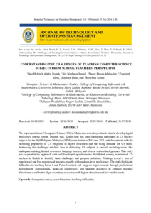 Mahadzir, Nurul Husna and Abdul Razak, Nor Hafizah and Ismail, Siti Nurbaya and Idrus, Zanariah and Idrus, Zainura and Ramli, Roselina (2024) Understanding the Challenges of Teaching Computer Science Subjects from School Teachers’ Perspective. Journal of Technology and Operations Management (JTOM), 19 (1). pp. 1-10. ISSN 2590-4175