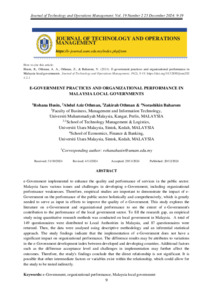 Husin, Rohana and Othman, Abdul Aziz and Othman, Zakirah and Baharom, Norashikin (2024) E-Government Practices and Organizational Performance in Malaysia Local Governments. Journal of Technology and Operations Management (JTOM), 19 (2). pp. 9-19. ISSN 2590-4175