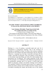 Md Salleh, Anis Shuhaiza and Abdul Jalil, Najah Inani and Md Nasir, Nor Ashikin and Awang, Syahmi (2024) Islamic Family Law on Polygamous Marriage in Malaysia: Between Roses and Thorns. Jurnal Pembangunan Sosial (JPS), 27. pp. 25-49. ISSN 1394-6528