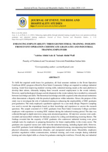 Abdul Aziz, Azirine and Abdul Wafi, Anisah (2024) Enhancing Employability Through Industrial Training: Insights from Event Operation Certificate Graduates and Industrial Training Employers. Journal of Event, Tourism and Hospitality Studies (JETH), 4. pp. 1-15. ISSN eISSN 2805-4423