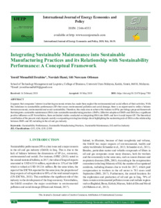 Ibrahim, Yousif Munadhil and Hami, Norsiah and Othman, Zakirah (2019) Integrating Sustainable Maintenance into Sustainable Manufacturing Practices and its Relationship with Sustainability Performance: A Conceptual Framework. International Journal of Energy Economics and Policy, 9 (4). pp. 30-39. ISSN 2146-4553