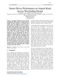The purpose of this study was to evaluate the wayfinding and signage provisions, sensitivity of senior driving behavior and road safety. A driving simulator to simplify the airport navigation was developed. Three scenario types were designed to provide a variety of driving situations and complexity of the road designs to the airport. The complexity of way finding with the assorted road furniture such as signage adverts and street lights also were included. Experience car drivers who held valid UK driving license were asked to drive simulated routes. Fifteen drivers in range of age 50-54, 55-59 and over 60 years were selected to perform the study. Participants drove for approximately 20 minutes to complete the simulated driving. The types of errors (parameter) of simulated driving were identified: risk of collisions, exceed the speed limit, traffic light tickets, centreline crossings and road edge excursions. The drivers’ performance and parameter were compared to the age group. Results were analyzed by ANOVA and discussed with reference to the use of driving simulator. The ANOVA confirmed that senior drivers’ age group have no significant effect on the airport road design, wayfinding and all research parameters; risk of collisions, exceed the speed limit, traffic light tickets, centerline crossings and road edge excursions
