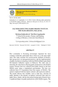 Kalimuthu, Kirttana and Applanaidu, Shri Dewi (2024) Factors Effecting Paddy Productivity in the MADA Regions, Malaysia. Malaysian Management Journal (MMJ), 28. pp. 145-172. ISSN 0128-6226