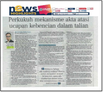 | Uncontrolled Keywords: | Komentar / Perkukuh Mekanisme Akta Atasi Ucapan Kebencian Dalam Talian penulisan Dr. Hafidz Hakimi Haron pensyarah Kanan Pusat Pengajian Undang-Undang Universiti Utara Malaysia |