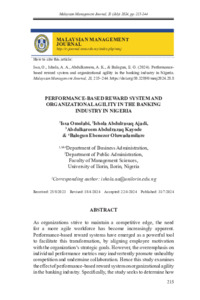 Omolabi, Issa and Ajadi, Ishola Abdulrasaq Ajadi and Kayode, Abdulkareem Abdulrazaq and Oluwadamilare, Balogun Ebenezer (2024) Performance-Based Reward System and Organizational Agility in the Banking Industry in Nigeria. Malaysian Management Journal (MMJ), 28. pp. 215-244. ISSN 0128-6226