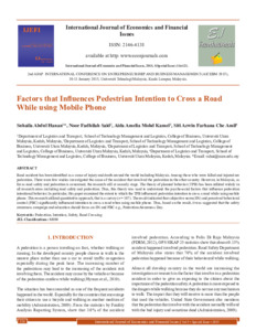 Abdul Hanan, Suhaila and Said, Noor Fadhilah and Mohd Kamel, Aida Amelia and Che Amil, Siti Azwin Farhana (2015) Factors that Influences Pedestrian Intention to Cross a Road While using Mobile Phone. International Journal of Economics and Financial Issues, 5 (1). pp. 116-121. ISSN 2146-4138