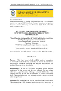 Mohamad Uri, Nurul Farehah and Abdul Aziz, Mohd Sallehhudin (2024) Materials Adaptation of Imported CEFR Textbooks: Teachers’ Perceptions and Practices. Malaysian Journal of Learning and Instruction (MJLI), 21 (2). pp. 23-47. ISSN 1675-8110