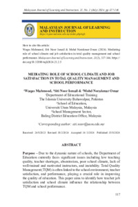 Mahmood, Waqas and Ismail, Siti Noor and Omar, Mohd Norakmar (2024) Mediating Role of School Climate and Job Satisfaction in Total Quality Management and School Performance. Malaysian Journal of Learning and Instruction (MJLI), 21 (2). pp. 117-146. ISSN 1675-8110