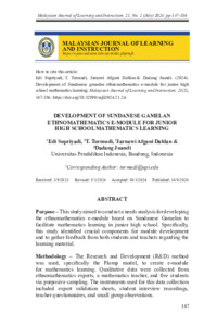 Supriyadi, Edi and Turmudi, T. and Dahlan, Jarnawi Afgani and Juandi, Dadang (2024) Development of Sundanese Gamelan Ethnomathematics E-Module for Junior High School Mathematics Learning. Malaysian Journal of Learning and Instruction (MJLI), 21 (2). pp. 147-186. ISSN 1675-8110