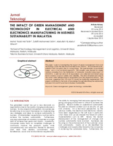 Md Taib, Mohd Yazid and Mohamed Udin, Zulkifli and Abdul Ghani, Abdullah (2015) The Impact of Green Management and Technology in Electrical and Electronics Manufacturing in Business Sustainability in Malaysia. Jurnal Teknologi, 77 (5). pp. 149-154. ISSN 2180-3722