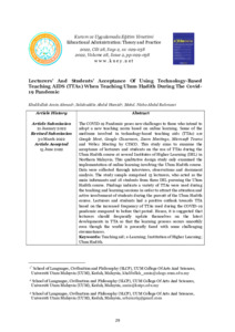 Ahmad, Khalilullah Amin and Abdul Hamid, Solahuddin and Abdul Rahman, Mohd Nizho (2022) Lecturers’ and Students’ Acceptance of Using Technology-Based Teaching AIDS (TTAs) When Teaching Ulum Hadith During the Covid-19 Pandemic. Educational Administration: Theory and Practice, 28 (2). 029-038. ISSN 13004832