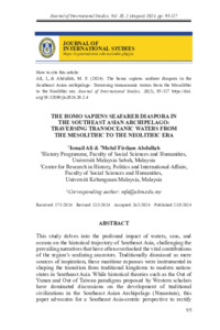 Ali, Ismail and Abdullah, Mohd Firdaus (2024) The Homo Sapiens Seafarer Diaspora in the Southeast Asian Archipelago: Traversing Transoceanic Waters from the Mesolithic to the Neolithic Era. Journal of International Studies (JIS), 20 (2). pp. 95-117. ISSN 1823-691X