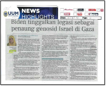 | Uncontrolled Keywords: | Komentar / Biden Tinggalkan Legasi Sebagai Penaung Genosid Israel Di Gaza penulisan Prof Madya Dr Norafidah Ismail Pensyarah Pusat Pengajian Antarabangsa Universiti Utara Malaysia |