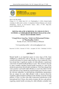 Chong, Edwyn Seng Yau and Abdul Aziz, Mohammad Firdaus and Thambapillay, Sridevi (2024) Mental Health Screening in Child Justice Systems: a Comparison between Malaysia and Selected Jurisdictions. Journal of International Studies (JIS), 20 (2). pp. 277-308. ISSN 1823-691X