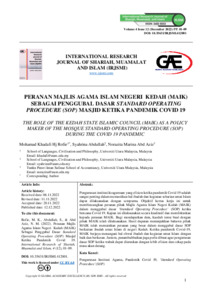 Rofie, Mohamad Khadafi and Abdullah, Syahrina and Abd Aziz, Norazita Marina (2022) Peranan Majlis Agama Islam Negeri Kedah (MAIK) sebagai penggubal dasar Standard Operating Procedure (SOP) masjid ketika pandemik Covid 19. International Research Journal of Shariah, Muamalat and Islam, 4 (12). pp. 1-9. ISSN 2682-8553