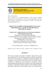 Osei, Francis and Abakah, Anthony Harrison Ato Kwamena and Kankam-Kwarteng, Collins (2024) Impact of Celebrity Endorsements on Sales Performance: A Study of the Beverage Industry in Ghana. Journal of Business Management and Accounting (JBMA), 14 (2). pp. 277-305. ISSN 2231-9298 (e2636-9249)