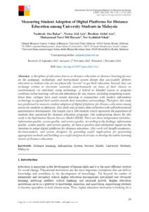 Abu Bakar, Nashirah and Abdul Aziz, Ibrahim and Md Hussain, Muhammad Nasri and Ishak, Nor Syahidah (2023) Measuring Student Adoption of Digital Platforms for Distance Education among University Students in Malaysia. International Journal of Advanced Research in Education and Society, 5 (4). pp. 16-28. ISSN 26828138