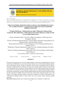 Mohd Rozar, Norlinda and Sidik, Mohamad Hazeem and Razik, Muhammad Ashlyzan and Lismawati, Lismawati and Hayu, Rina Suthia and Indriya Himawan, Abdurrahman Faris and Chuah, Lai Fatt and Mohd Zawawi, Nur Fadiah (2025) Impact of Poor Communication, Fatigue, and Experience Levels on Accident Rates: A Case Study of The Malaysian Maritime Shipping Industry. Journal of Technology and Operations Management (JTOM), 20 (1). pp. 18-28. ISSN 2590-4175 (Online)